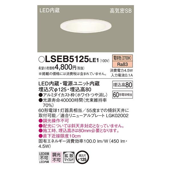 パナソニック LSEB5125 LE1 LEDダウンライト 天井埋込型 φ125 電球色 450lm 浅型8H 高気密SB形 拡散型 非調光 ホワイト 『LSEB5125LE1』