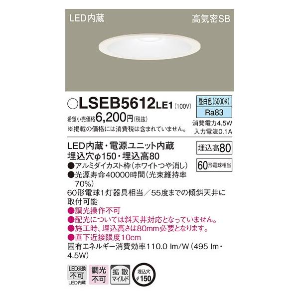 パナソニック LSEB5612 LE1 LEDダウンライト 天井埋込型 浅型8H 高気密SB形 昼白色 拡散タイプ マイルド配光 埋込穴φ150 LED一体形 『LSEB5612LE1』