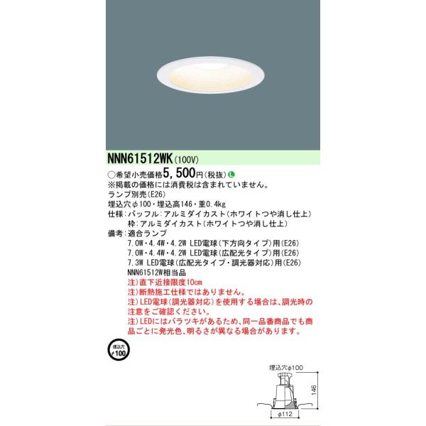 [法人限定] NNN61512WK パナソニック ※ランプ別売 埋込型 LED電球ダウンライト 埋込穴φ100