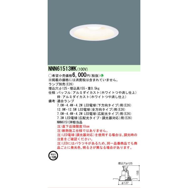 [法人限定]NNN61513WK パナソニック ※ランプ別売 埋込型 LED電球ダウンライト 埋込穴φ125