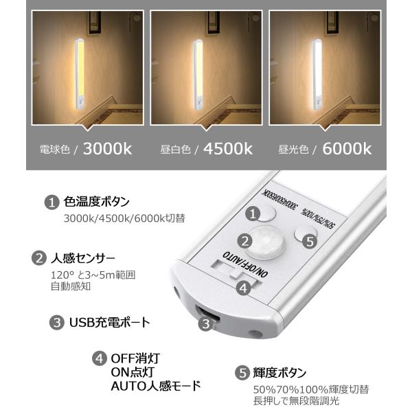 人感センサーライト LED バーライト 40cm USB充電式 9mm超薄型 無段階調光 色温度調整 120° 3m距離 マグネット