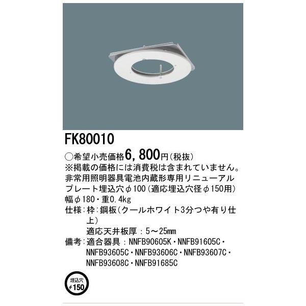 [法人限定][即納在庫有り] FK80010 パナソニック リニューアルプレート 電池内蔵型専用 φ100 適応埋込穴径φ150用 [ FK80010 ]