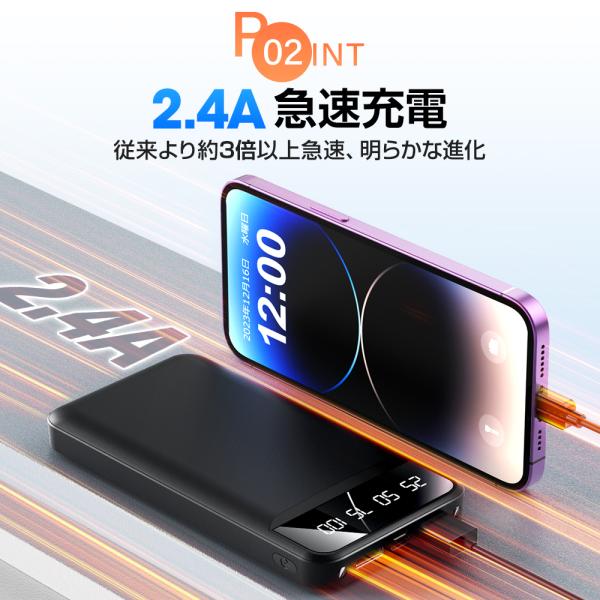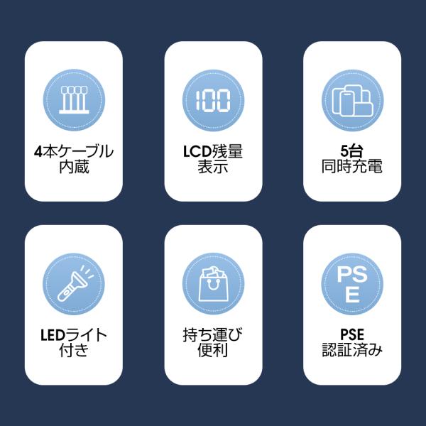 モバイルバッテリー 40000mAh 大容量 急速充電 軽量 4本ケーブル内蔵 薄型 5台同時充電 PSE 5v/2.4a スマホ充電器 残量表示 防災電源 iPhone/iPad/Android対応