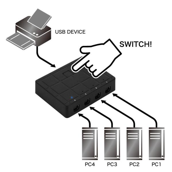USB2.0切替器 パソコン4台でUSB機器1台を切替共有 USB Bタイプ×4ポート コンパクトサイズ 手動切替式 LEDインジケーター付 バスパワー USBセレクター USBPT4TO1