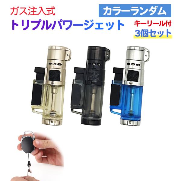 ライター 強火力 トリプルパワージェット式 ターボ式 着火ライター ガス詰替可 ストラップホール付 色ランダム キーリール 3個セット 送料無料