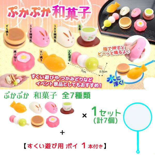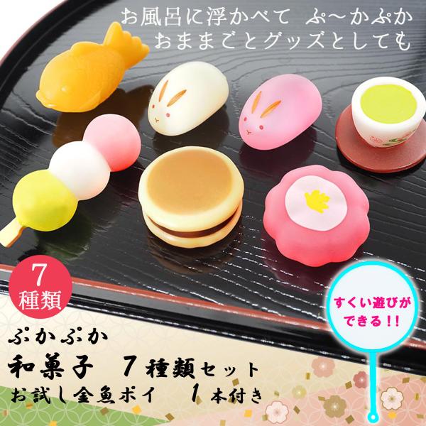 ぷかぷか おもちゃ「 和菓子 全7種類 ×1セット 合計7個」+「お試し 金魚ポイ 1本」(ご家庭 向け 小容量) お風呂遊び 浴室玩具 おままごと すくい遊び