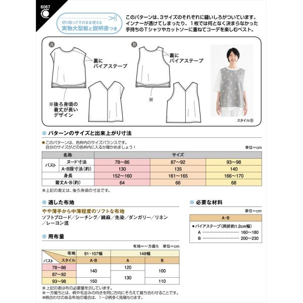 型紙 パターン Tシャツに重ねる ワイドベスト No.6067 フィットパターン サンプランニング 大人 子供 ベビー 赤ちゃん 作り方 洋裁