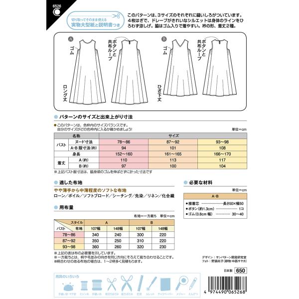 ノースリーブフレアーワンピース 6526 型紙 パターン フィットパターン サンプランニング 大人 子供 ベビー 赤ちゃん 作り方 洋裁 手作り 簡単 レシピ