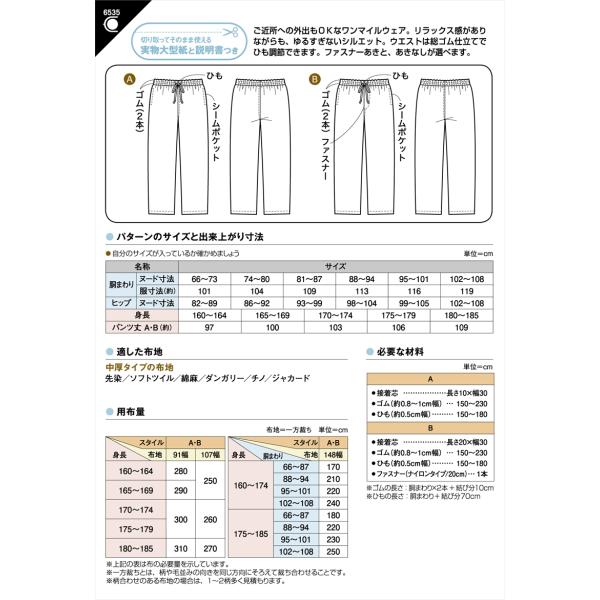 型紙 パターン メンズ イージーパンツ No.6535 フィットパターン サンプランニング 大人 子供 ベビー 赤ちゃん 作り方 洋裁