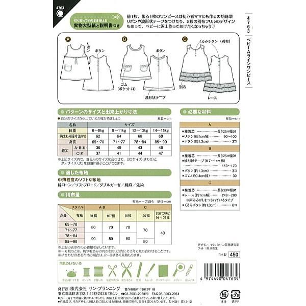型紙 パターン ベビーAラインワンピース ベビー女子(身長65-90cm) No.4763 フィットパターンサン サンプランニング 大人 子供 ベビー 赤ちゃん 作り方 洋裁