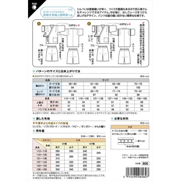 型紙 パターン 小学生じんべい 6060 フィットパターンサン サンプランニング 大人 子供 ベビー 赤ちゃん 作り方 洋裁