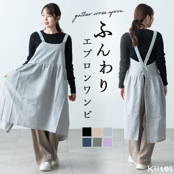 エプロン レディース おしゃれ バッククロス ギフト 保育士 仕事 綿 ギャザー チュニック 美容師 カフェ フリル ナチュラル