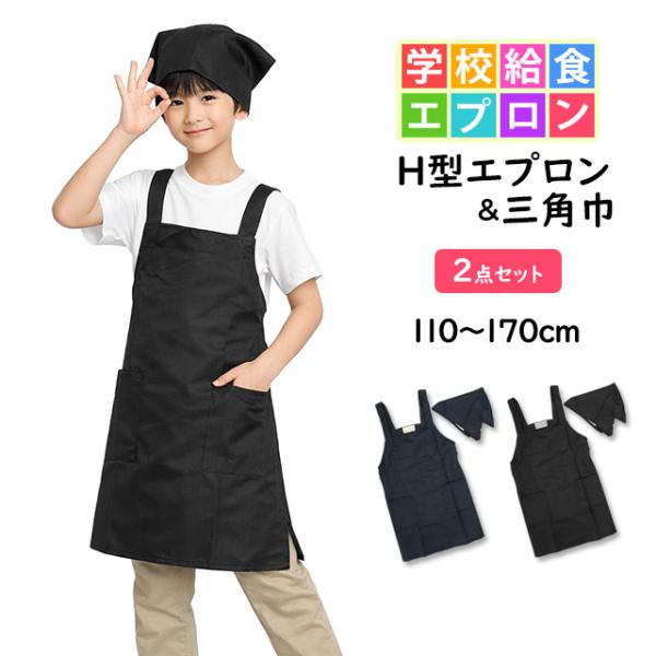エプロン 子供用 キッズ 無地 三角巾付き H型 小学校 学校 給食エプロン 男の子 女の子 三角布 エプロン2点セット 110cm130cm150cm