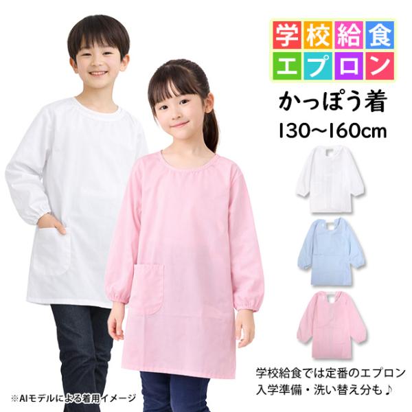 給食 エプロン かっぽう着 白衣 長袖 子供用 キッズ 男の子 女の子 無地 学校 子供エプロン 小学生 130cm 140cm 150cm 160cm