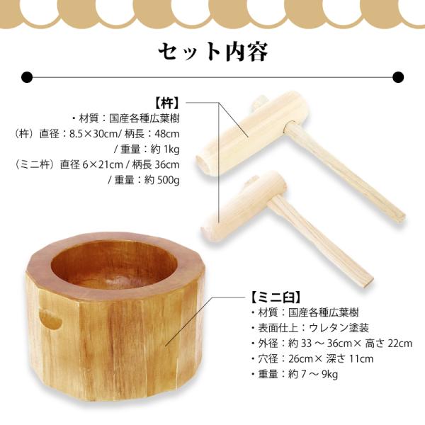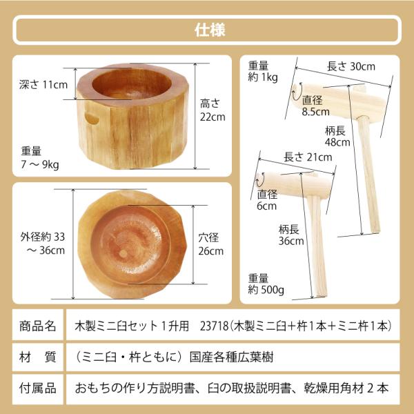 木製ミニ臼セット 1升用 23718 木製ミニ臼+キネ2本 1升 餅つき もちつき セット うす 臼 きね 杵 子供用 家庭用 道具 作り方付き おすすめ ナガノ産業 代引不可