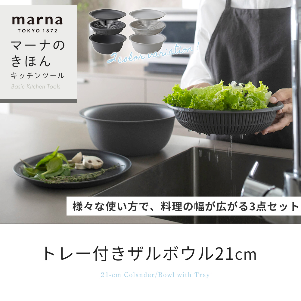 marna マーナ トレー付き ザルボウル 21cm K809 食洗機対応 レンジ対応 耐熱 蒸し器 3点セット 軽量 シンプル マーナのきほん