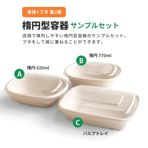 「サンプルセット:楕円型容器セット」使い捨て 容器 弁当箱 テイクアウト ランチボックス 業務用 セパレート レンジ 冷凍 持ち帰り パルプモールド