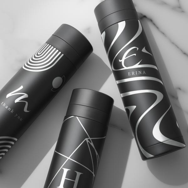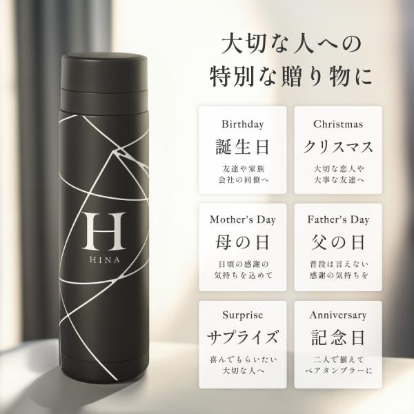 【名入れ無料】イニシャル入り ブラック 幾何学 ドリンクボトル 340ml マイボトル 水筒 イニシャル 名入れ 名前入り 蓋付き 柄 保冷 保温 ステンレス 二重構造