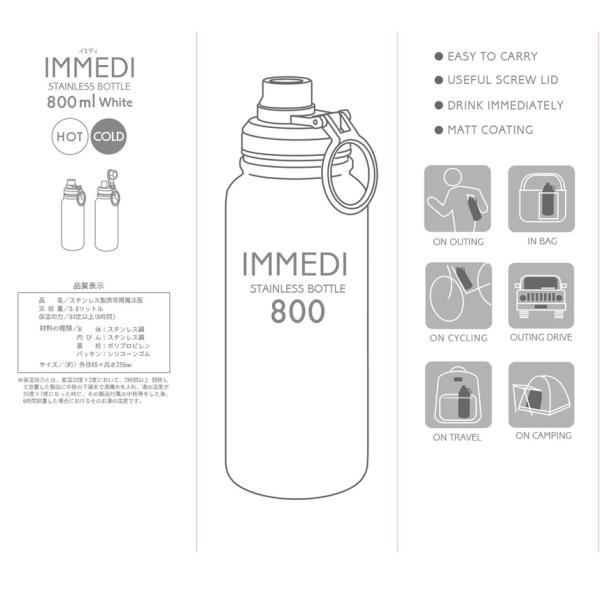 800ml ステンレスボトル ホワイト IMMEDI BOTTLE 保冷 保温 洗いやすい 広口 水筒 ボトル 800
