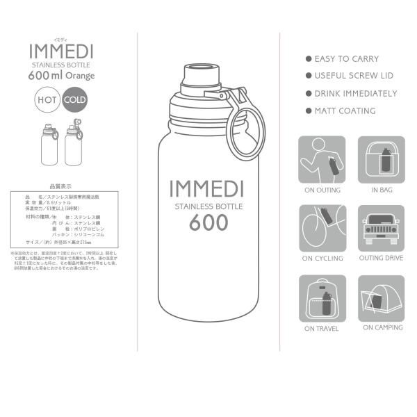 ボトル 保温 保冷 600ml IMMEDI BOTTLE 氷が入れやすい 洗いやすい 広口 直飲み 滑りにくい ステンレスボトル