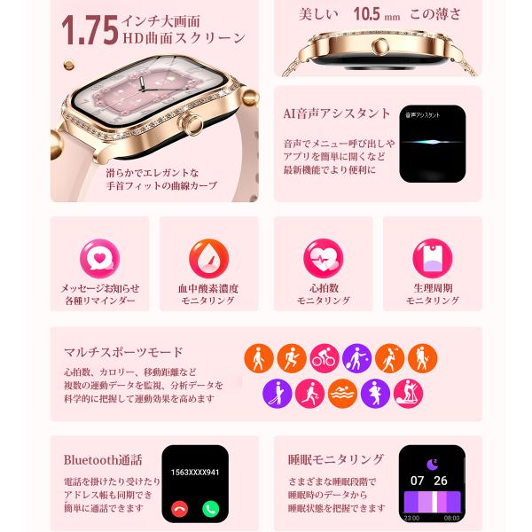 マートウォッチ レディース 日本製センサー 通話機能 1.75インチ大画面 高精度心拍数 脂質 睡眠 Phone/Android 母の日プレゼント 健康管理