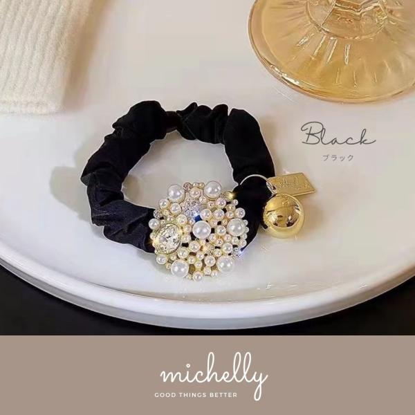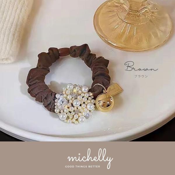 ヘアゴム パール ビジュー シュシュ 上品 高見え 結婚式 ブラック ブラウン サテン ゴールド ヘアアレンジ
