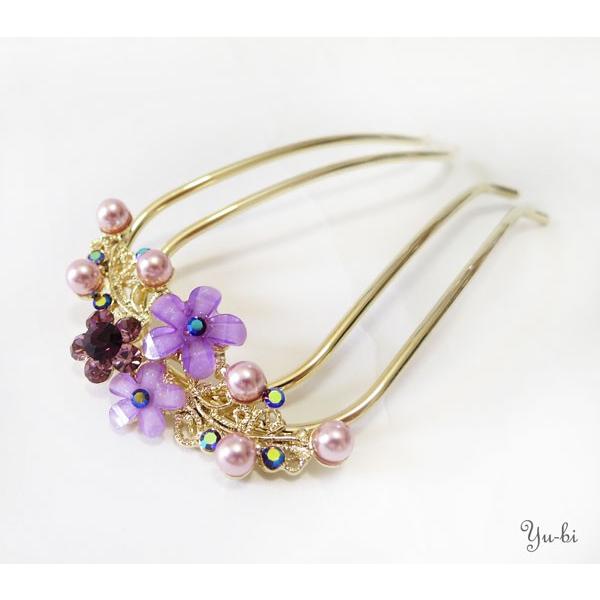 【ゆうパケット送料250円】夜会巻きコーム/ヘアコーム/コーム/ 大人かわいい 花つるフラワー パール ラインストーン cb99☆白/ピーチ/紫