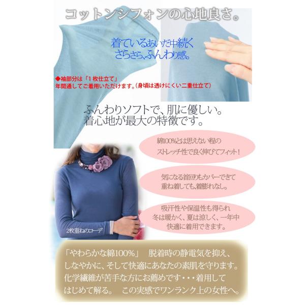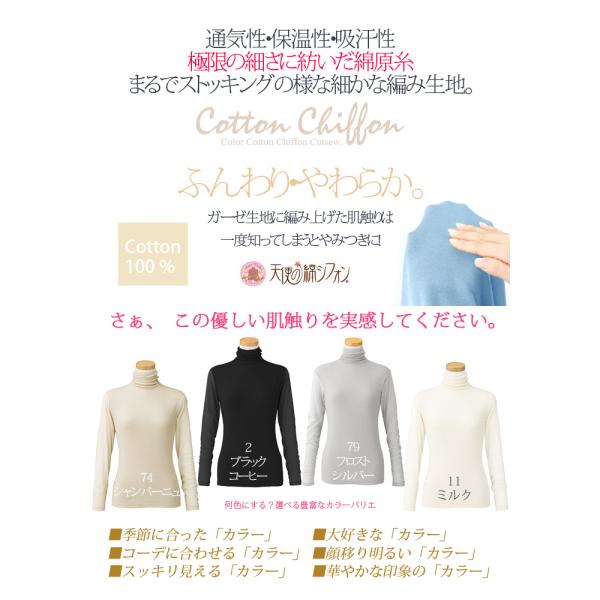 2026春夏 新色 全47色 天使の綿シフォン 綿100% ハイネック 長袖 カットソー 1重袖 レディース タートル ダブルガーゼ ボトルネック アイド 春 夏 秋 冬 9902