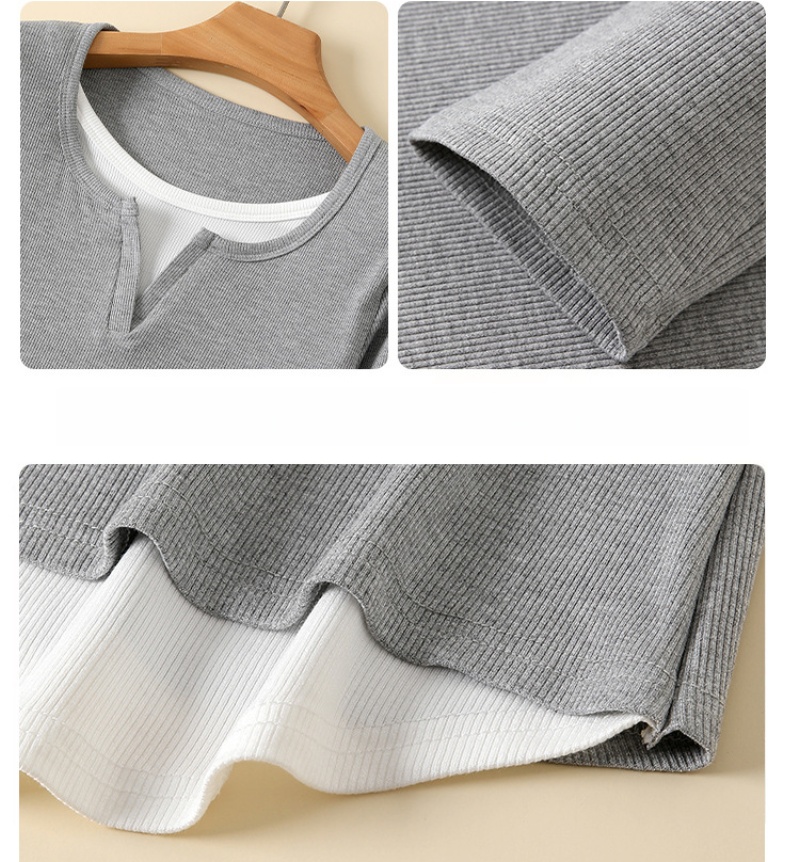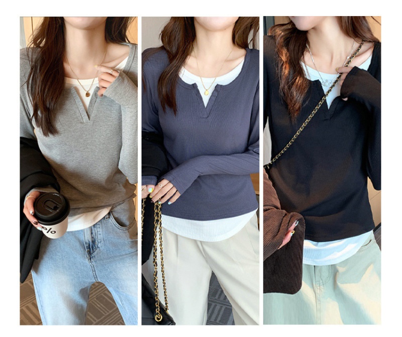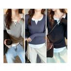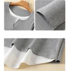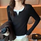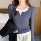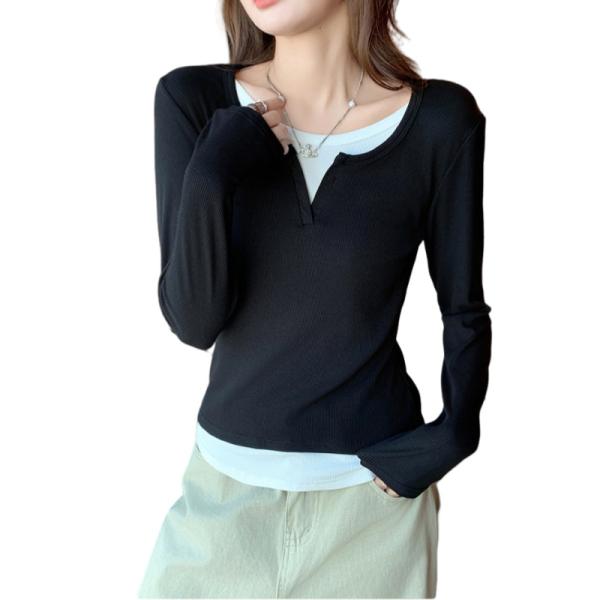 長袖Tシャツ レディース Vネック風Tシャツ リブカットソー 無地トップス 重ね着風トップス 春秋トップス 薄手Tシャツ シンプルカジュアル 通勤服 通学服