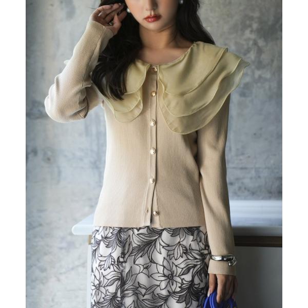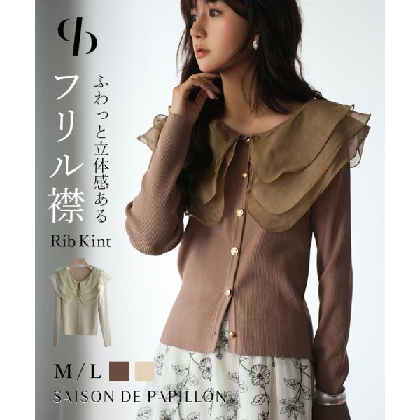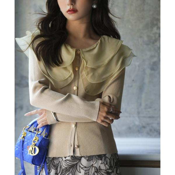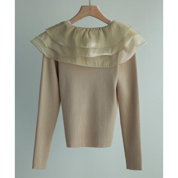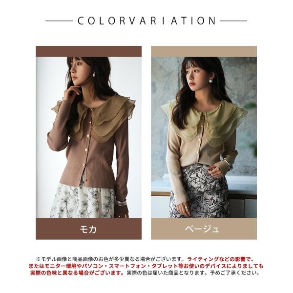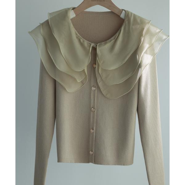 長袖 秋 冬 春 レディースニット ニット 異素材 異素材ミックス ドッキング ドッキングニット カーディガン プルオーバー フェミニン フリル 襟