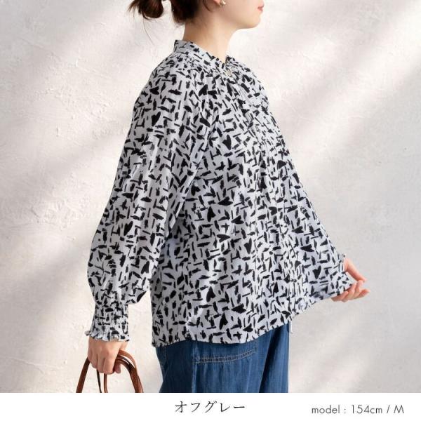【新作】【送料無料】 モダン柄シャーリングブラウス 3色 M L 洗える 長袖 レディース トップス ブラウス チュニック スタンドカラー フリル衿 とろみ素材