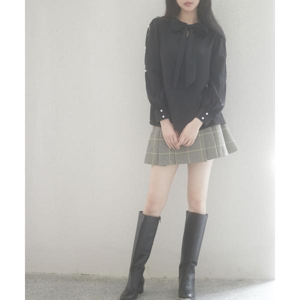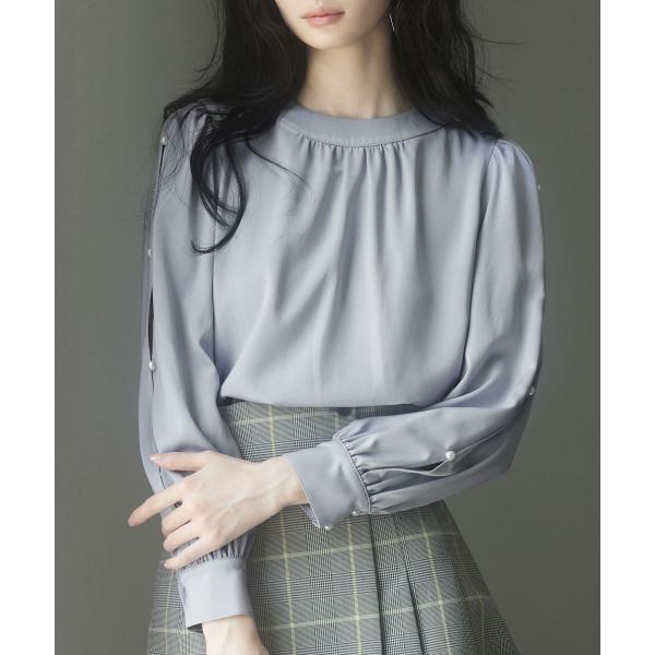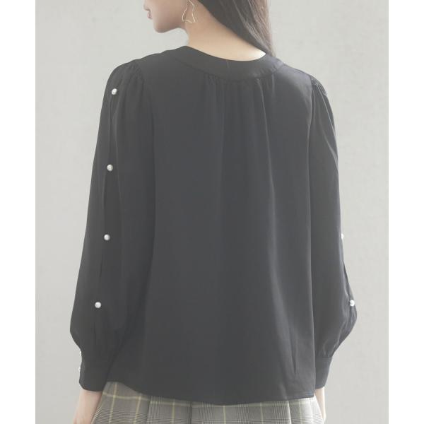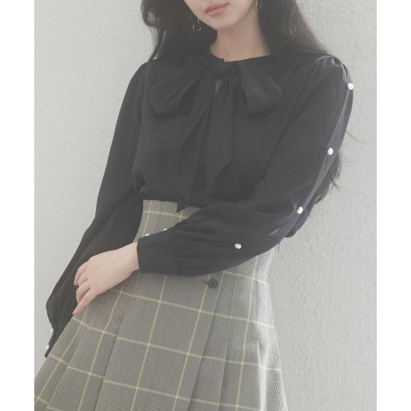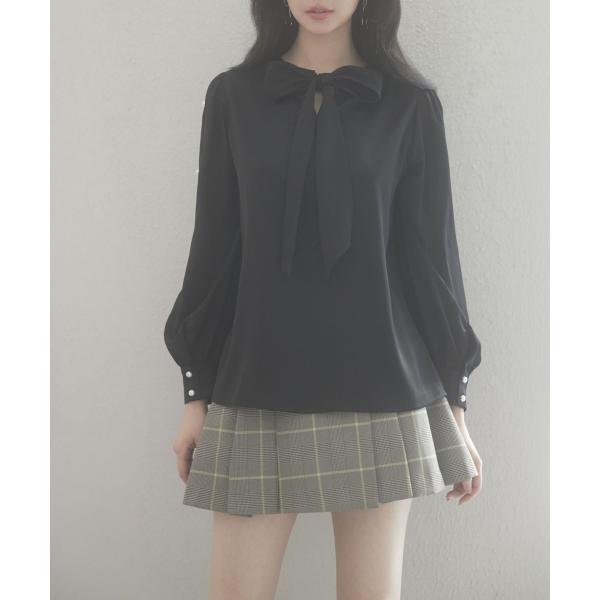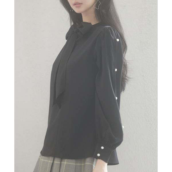 ブラウス レディース 長袖 クルーネック ゆったり ギャザー きれいめ リボン パールボタン ボタン開閉 とろみ素材 おしゃれ 可愛い オフィス