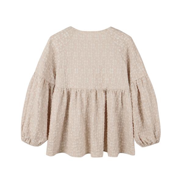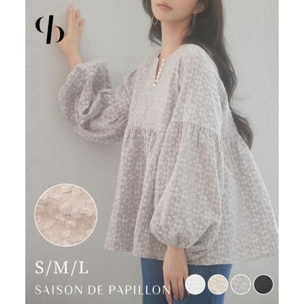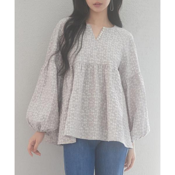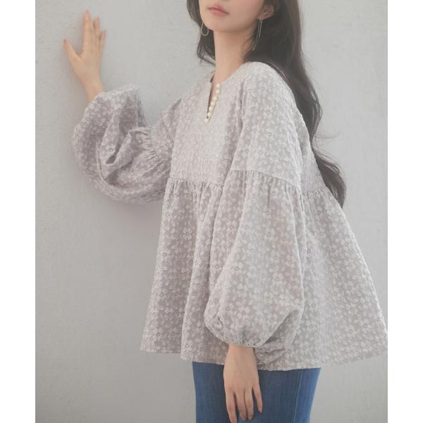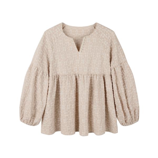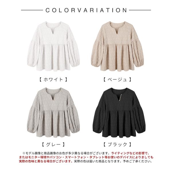 ブラウス レディース トップス 長袖 フクレジャガード生地 パール付き ボリューム袖 ゆったり ふんわり スキッパー キーネック 体型カバー 二の腕カ