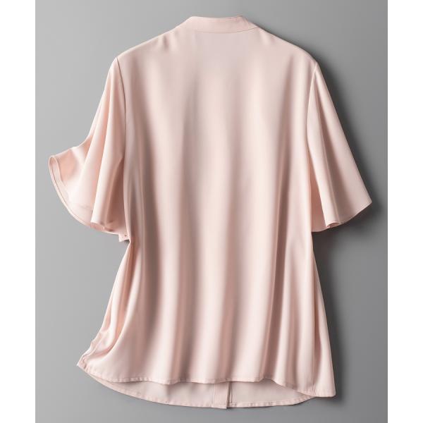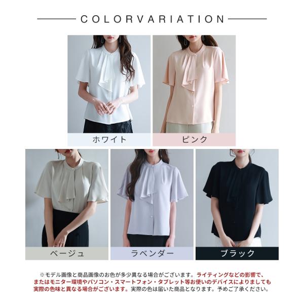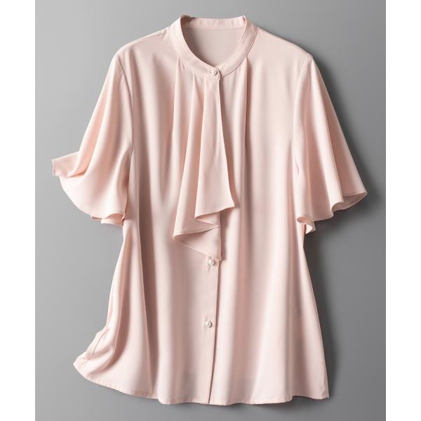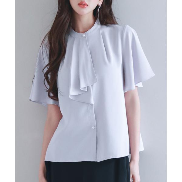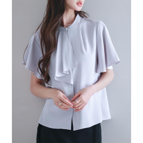 トップス レディース ブラウス ボウタイ風ネック フリルネック とろみ素材 ゆったり フレアスリーブ 二の腕カバー スタンドネック パールボタン 半袖