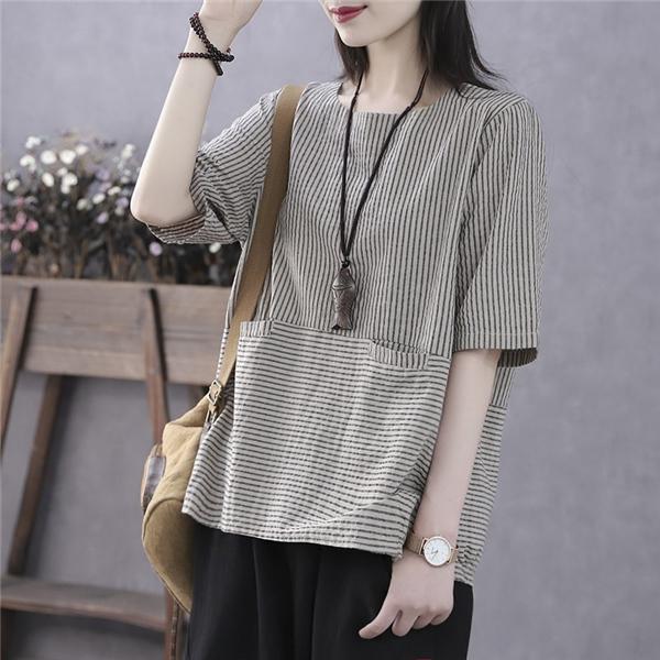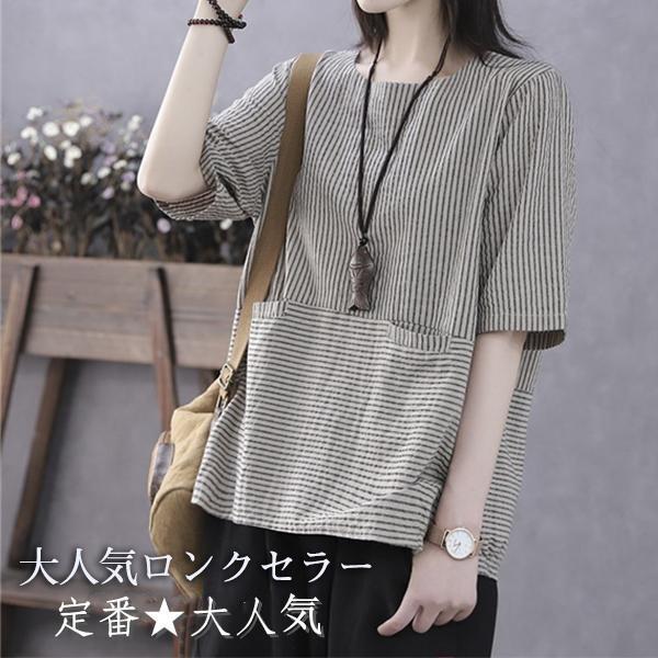 ブラウス トップス チュニック レディース ストライプ シャツ 春 夏 ゆったり 体型カバー ラウンドネック シンプル オーバーサイズ 送料無料