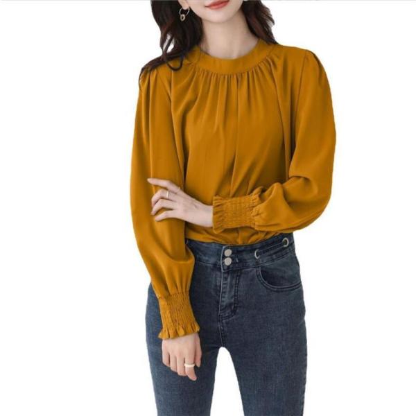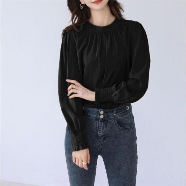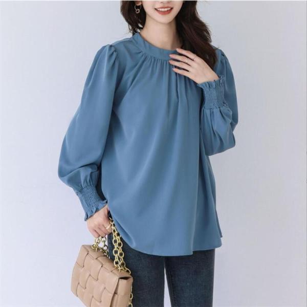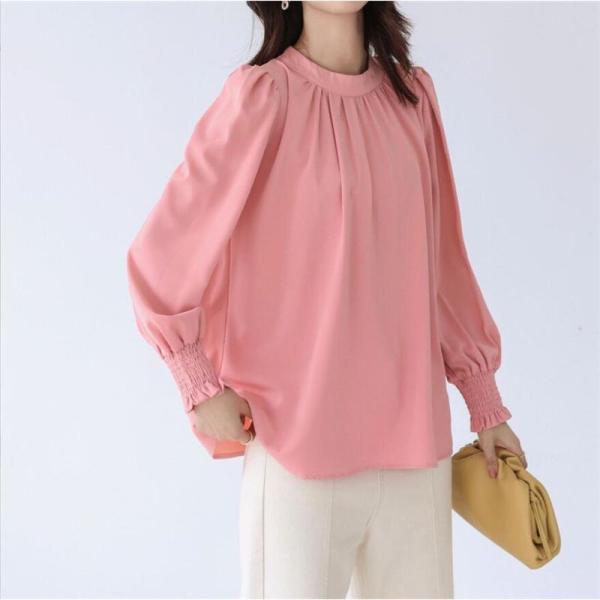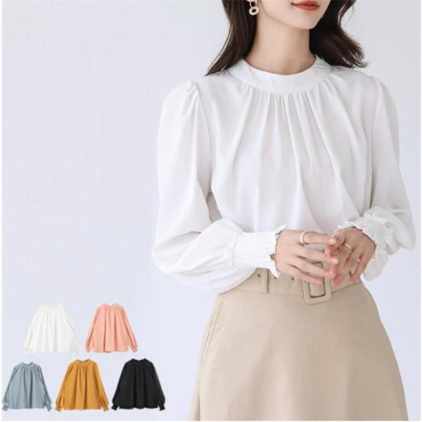 ブラウス レディース シャツ 長袖 オフィス ハイネック スタンドカラー クルーネック パフスリーブ ゆったり 無地 フリル 通勤 入学式 上品 人気