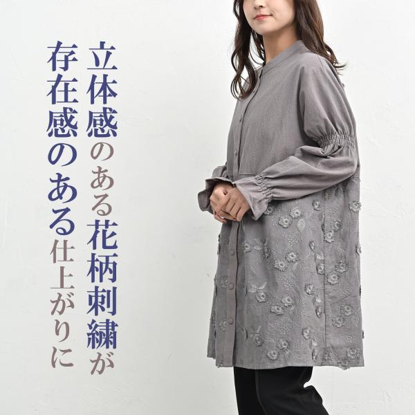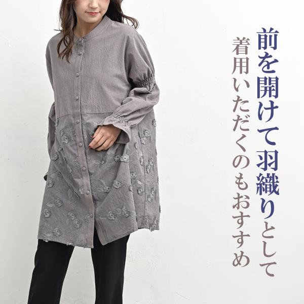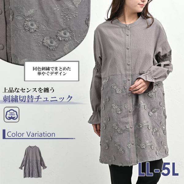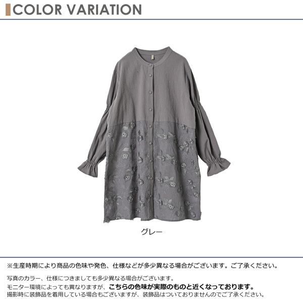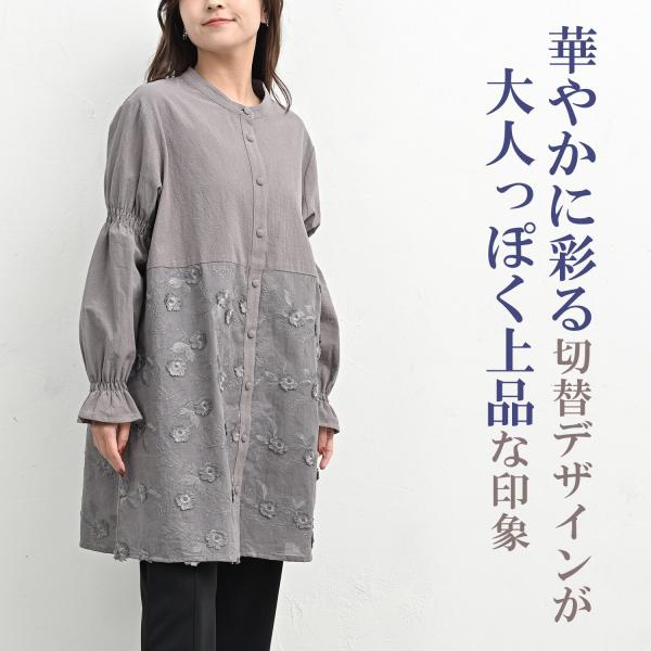 レース切替チュニック 大きいサイズ レディース 長袖 前開きボタン キャンディスリーブ トップス cotton100 LL 3L 4L 5L 送料無料※沖縄/北海道対象外
