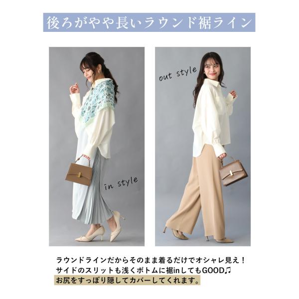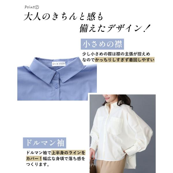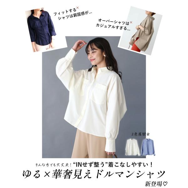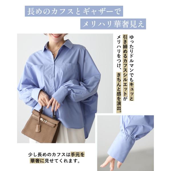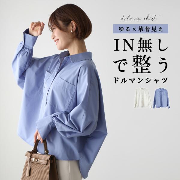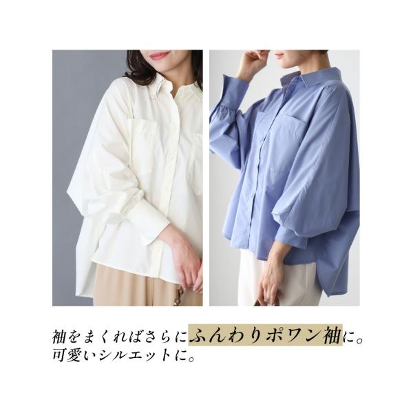 シャツ ドルマントップス ボリューム袖 長袖 開襟シャツ ボタン ポケット 無地 ゆったり 体型カバー ホワイト ブルー