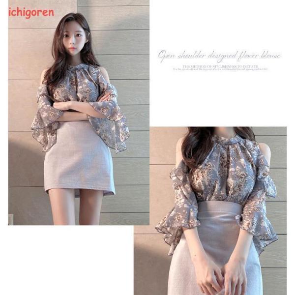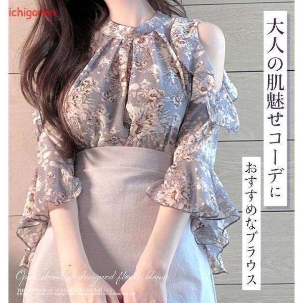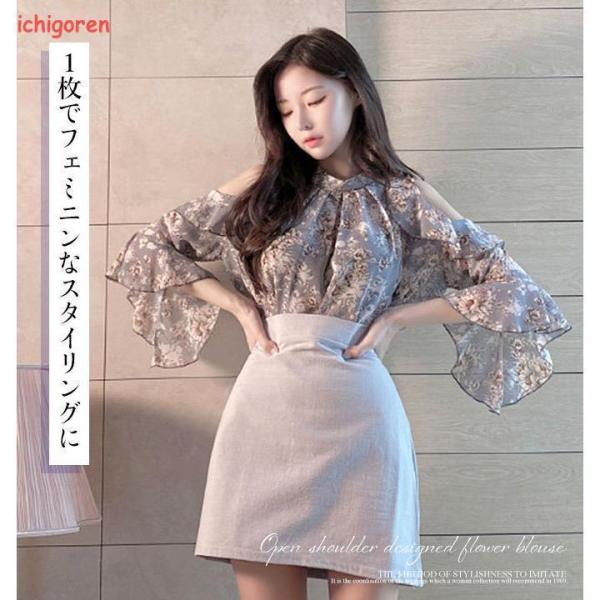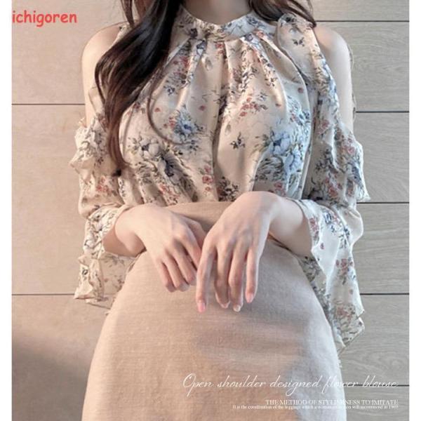 ブラウス レディース おしゃれ オープンショルダー 花柄 きれいめ 流行 韓国ファッション ライトベージュ ライトブルー