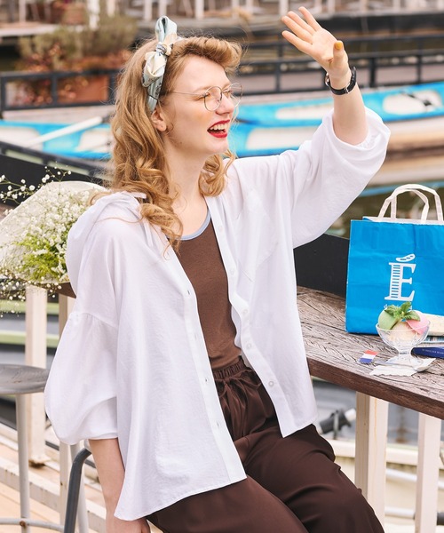 ブラウス シャツ 「UVカット率97%」ライトシアーギャザー 涼しげ オーバーフーディーシャツパーカー「纏うUVケア - ソルヴェール」 レディース