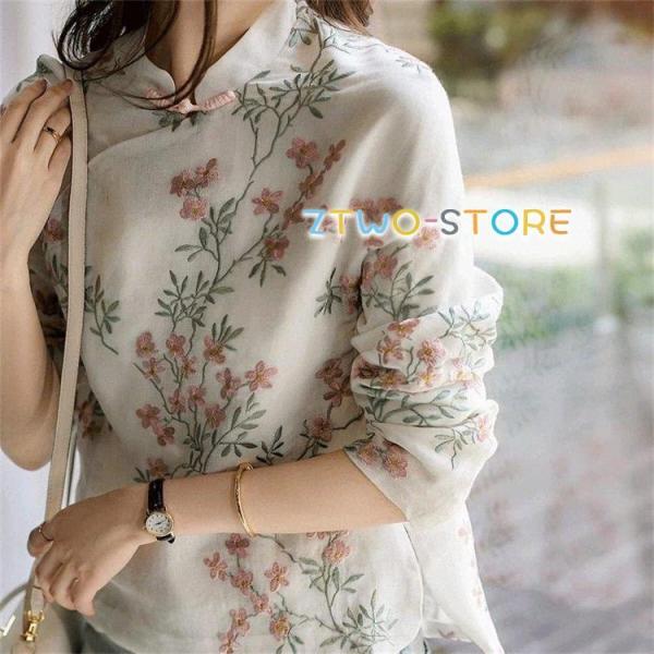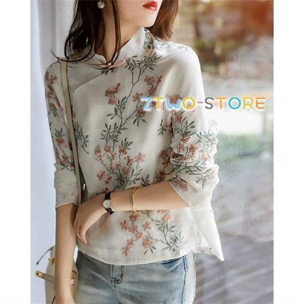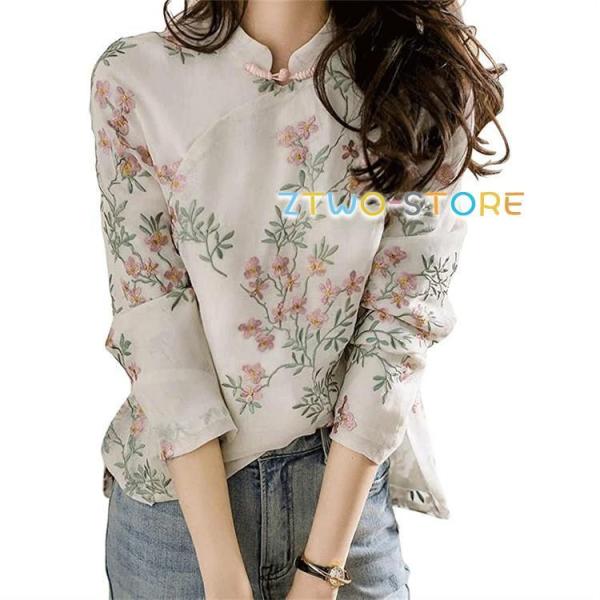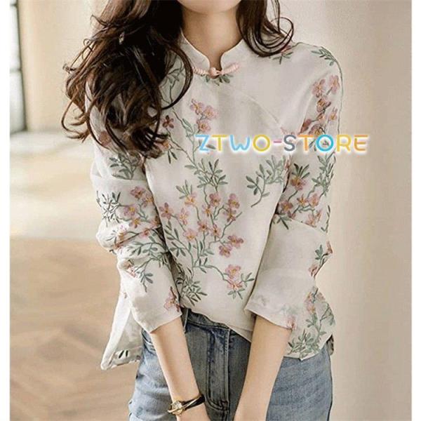 ブラウス レディース トップス 春秋 春物 ブラウス チャイナボタン 長袖 中華風 ゆったり グレー パープル 夏 チャイナボタン 花柄 フリーサイズ カジュアル