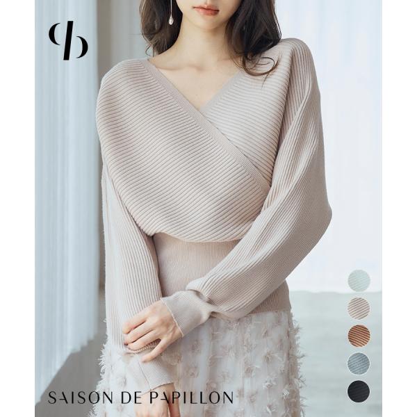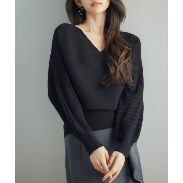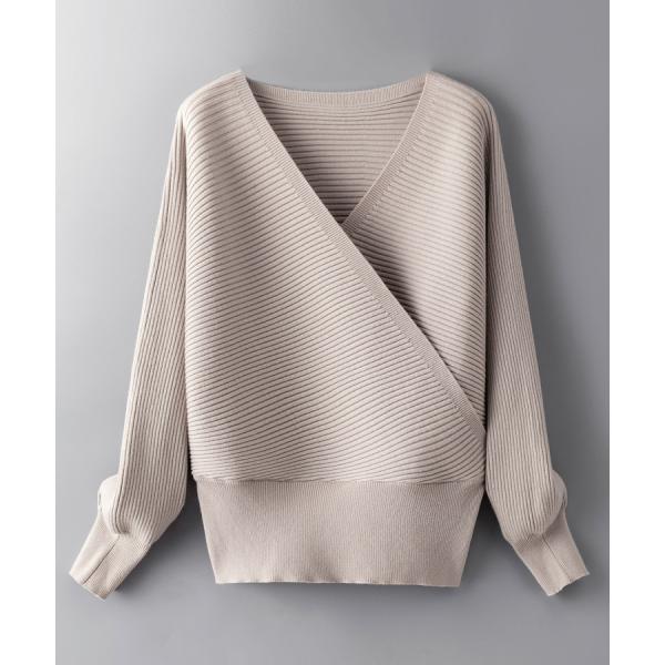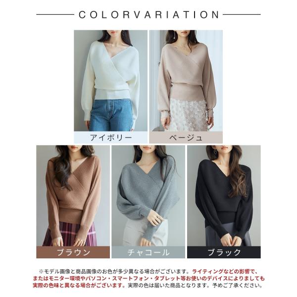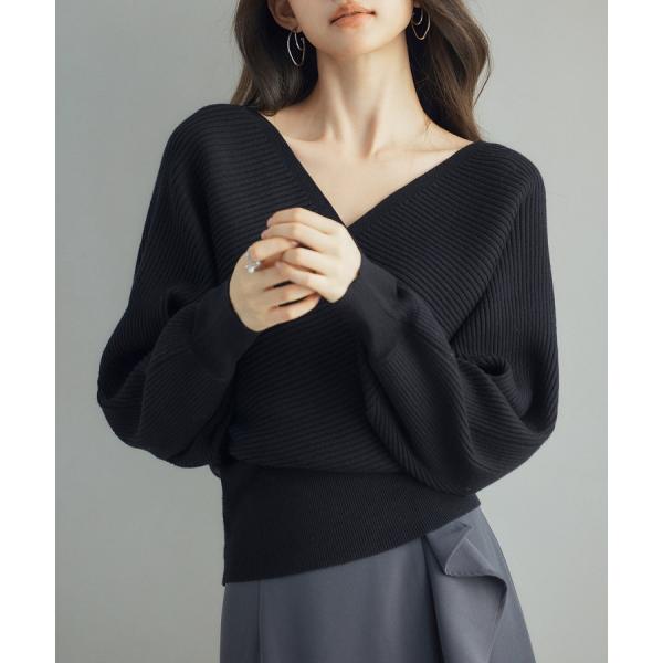 ニット レディース トップス カシュクール ドルマンスリーブ 二の腕カバー ウエストシェイプ デコルテ見せ Vネック リブ編み ウエストリブ長め ボリ