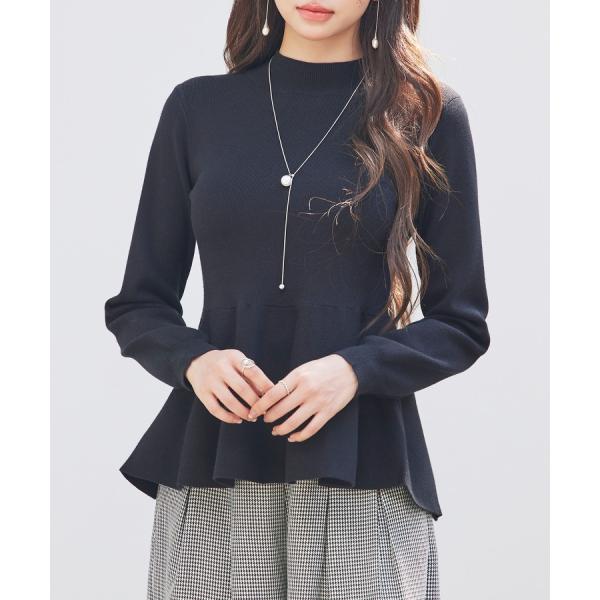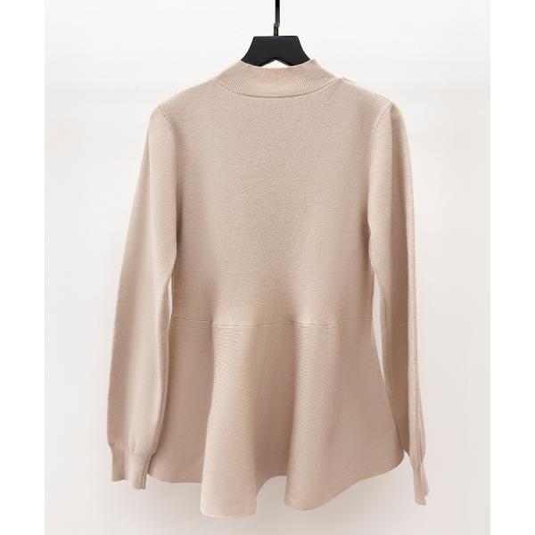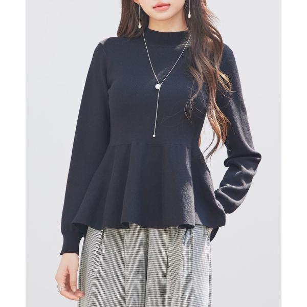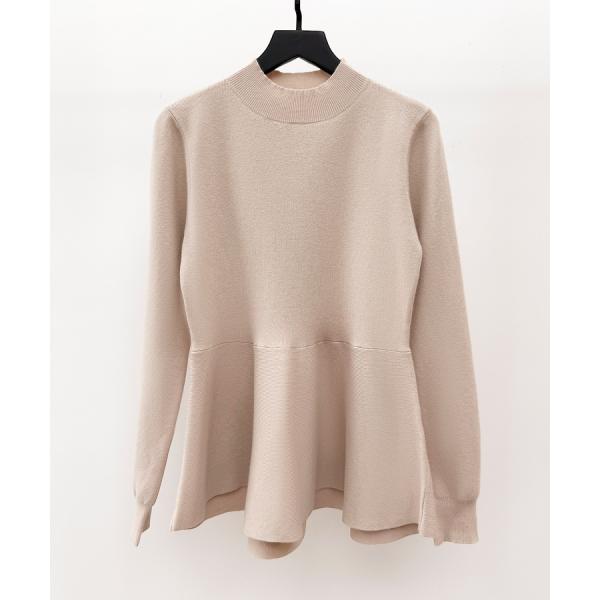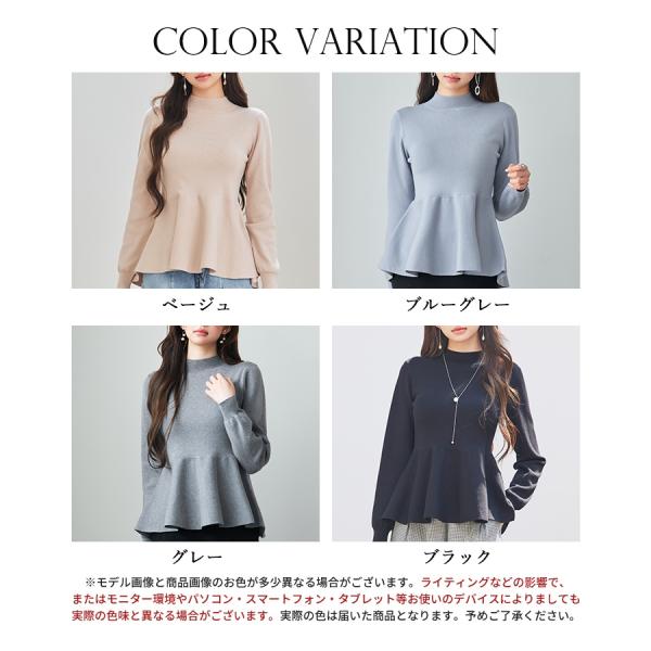 トップス レディース ニット ペプラムニット 長袖 モックネック ビショップスリーブ フレアシルエット 体型カバー お腹周りカバー やや厚手 温かい