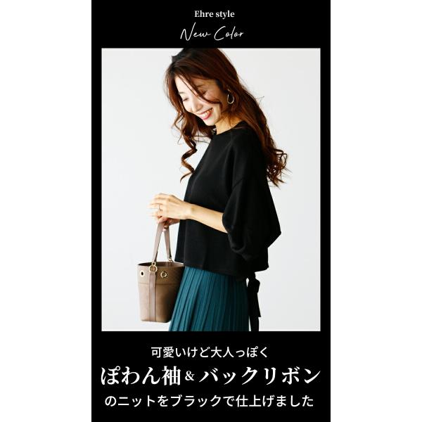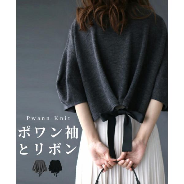 トップス カットソー パフスリーブ 七分袖 六分袖 ショート丈 五分袖 ニット バックリボン ぽわん袖 リボン 大人可愛い 甘い 甘め
