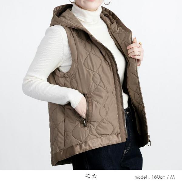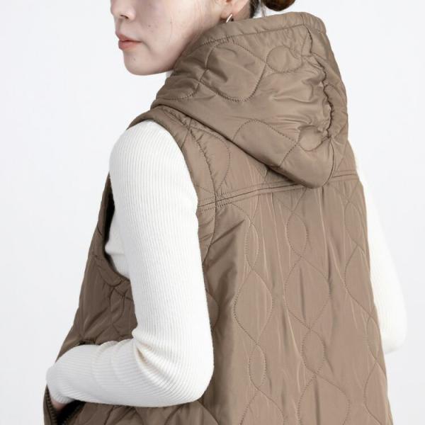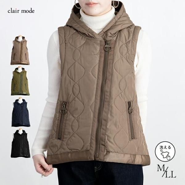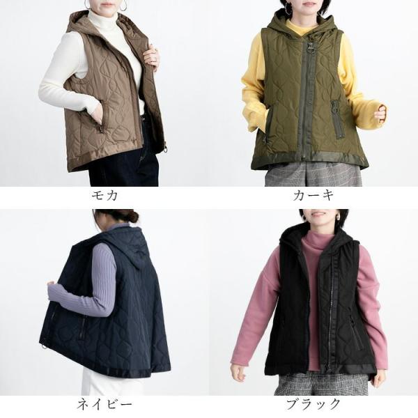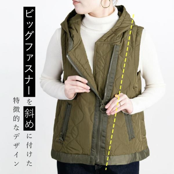 【送料無料】 BIG ZIP使いキルティングベスト 4色 M-LL 中綿 洗える レディース アウター ベスト フード付き 袖なし 保温性