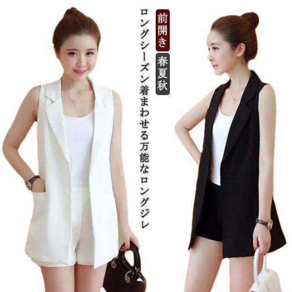 ジレ レディース 春 夏 秋 フォーマル ベスト キレイめ テーラード テーラードベスト ミドル丈 スーツノースリーブ シンプル 羽織り 前開き