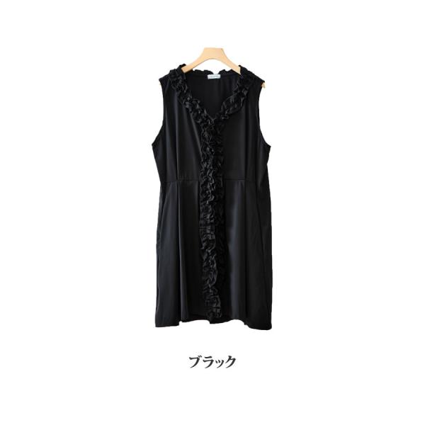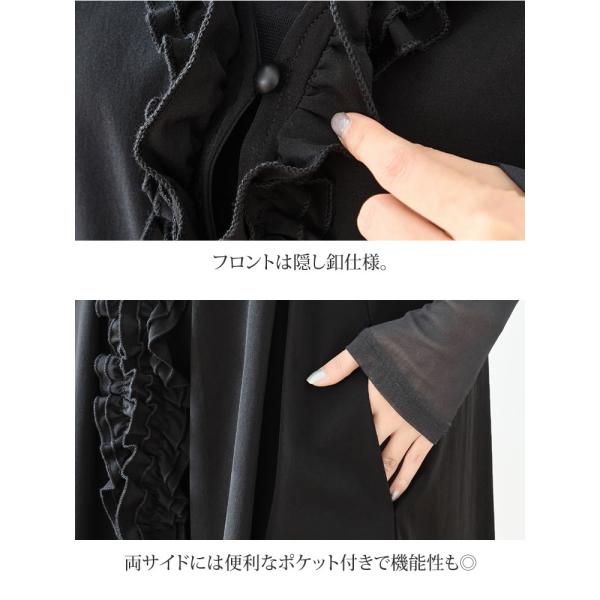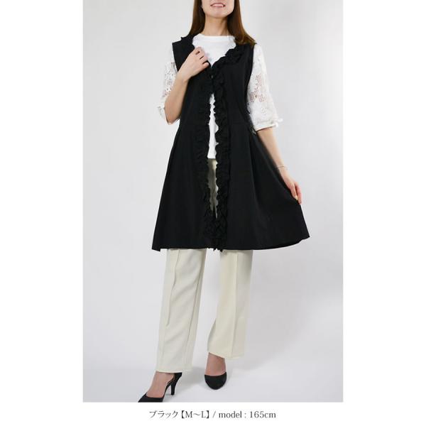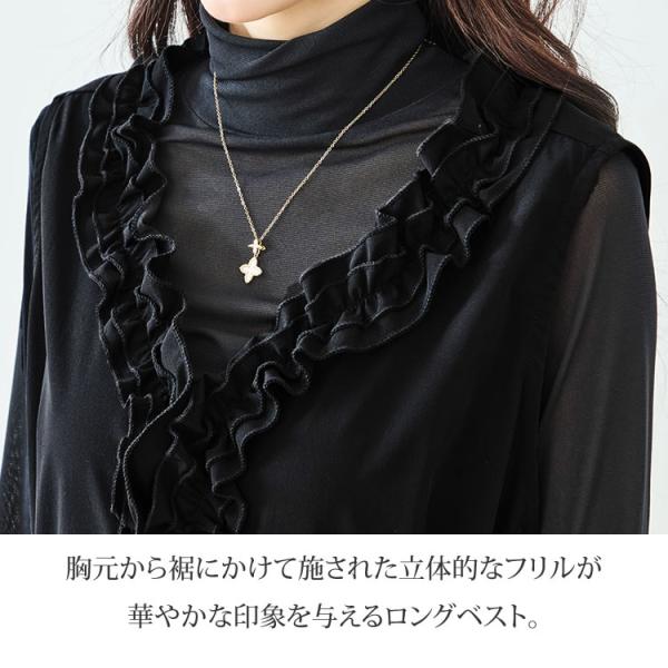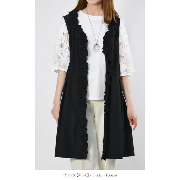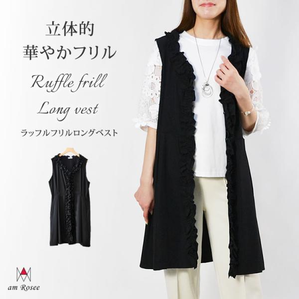 ラッフル フリル ロング ベスト レディース アウター ジレ 黒 羽織 ノースリーブ レイヤード 体型カバー 春 夏 秋 aライン vネック きれいめ