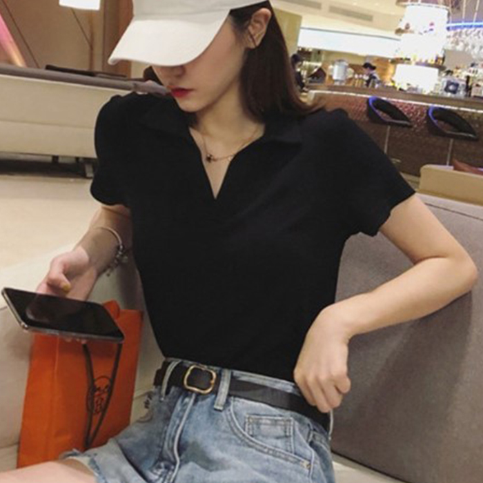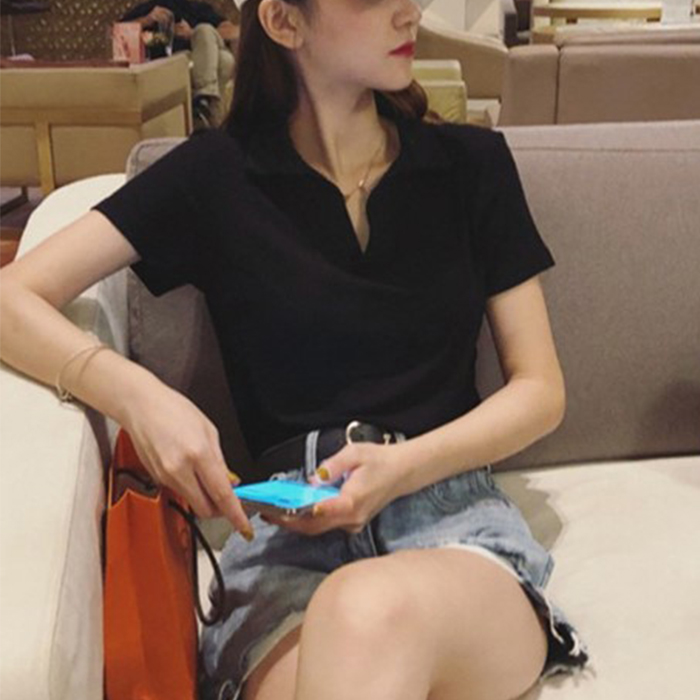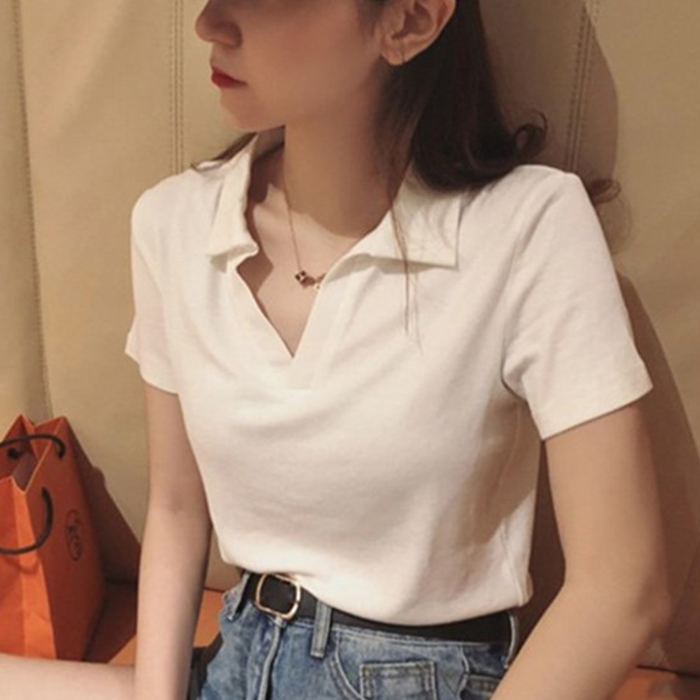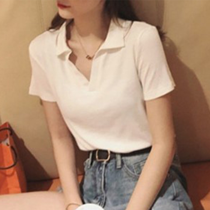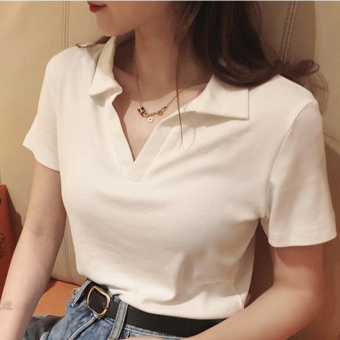 レディース ポロシャツ tシャツ 半袖 無地 トップス スキッパー Vネック ショート丈 クロップドかわいい カーブヘム ラウンドカット