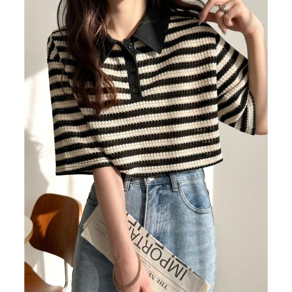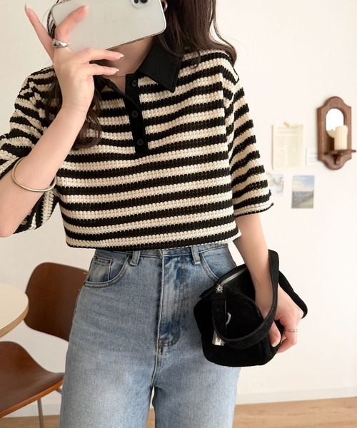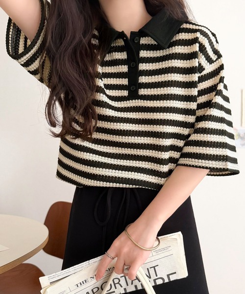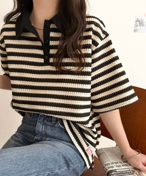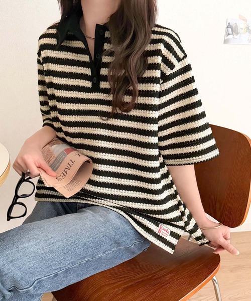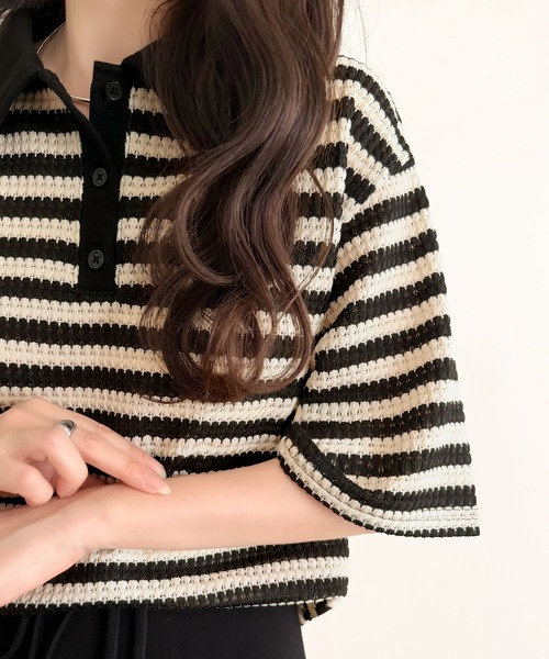 ポロシャツ ポロ 「JaVaジャバコラボ」大人カジュアルを格上げ。クロシェレース風ボーダーポロ衿トップス(半袖) レディース