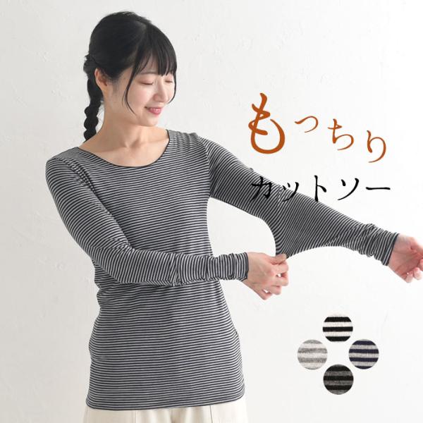 2点までメール便可 インナーカットソー ボーダー 長袖 レディース もっちり ストレッチ 伸びる クルーネック 無地 24AW0904R,